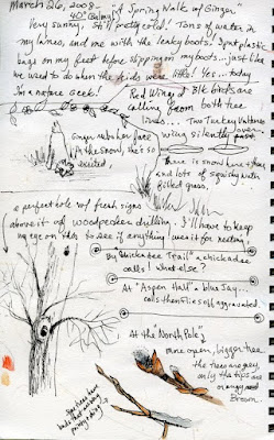 Today I couldn't resist the sunshine, it was a 'balmy' 40 degrees so I took my field pack and told Ginger we're going for a hike! She, of course could barely contain her excitement! If you click on any picture you can see the enlarged version, and read my actual notes. There were Red Winged Black birds calling from the tree tops and some Turkey Vultures sailing overhead silently. I sketched a tree with a hole that lookes perfect for something to have a nest in, I'll have to watch this spring.